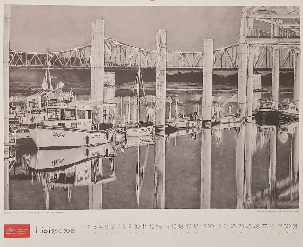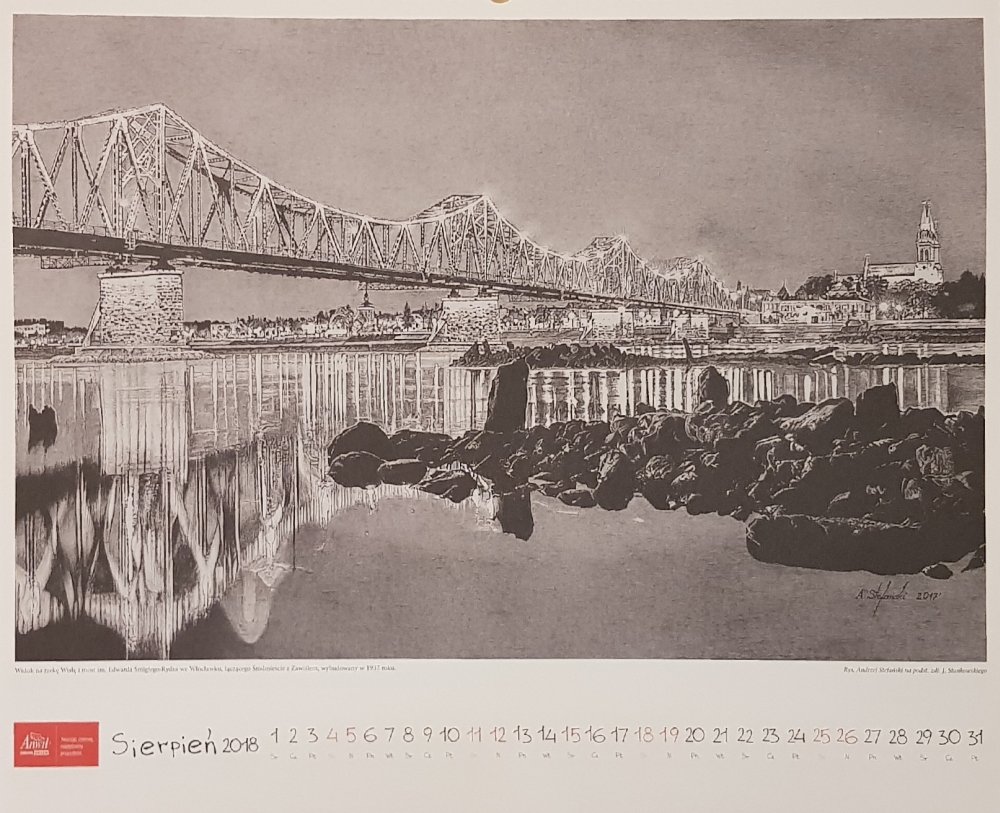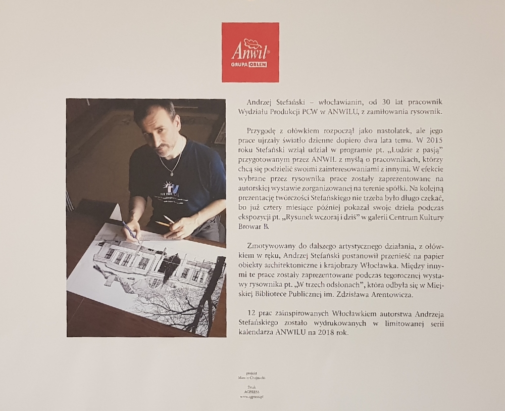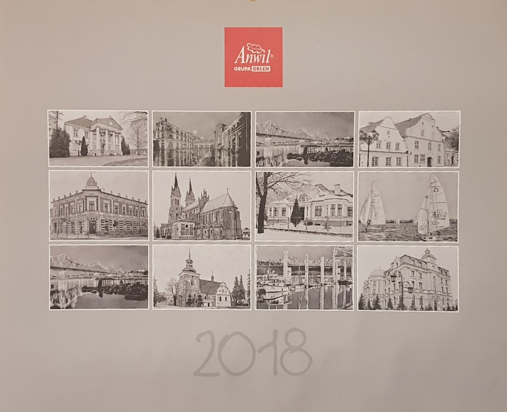 Kalendarz na rok 2018 z pracami włocławianina Andrzeja Stefańskiego ukazujące piękno naszego miasta. Kalendarz wydany przez Anwil-Grupa Orlen.